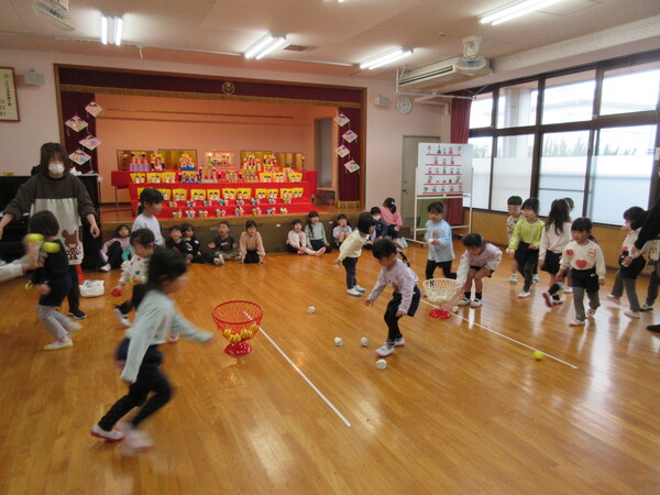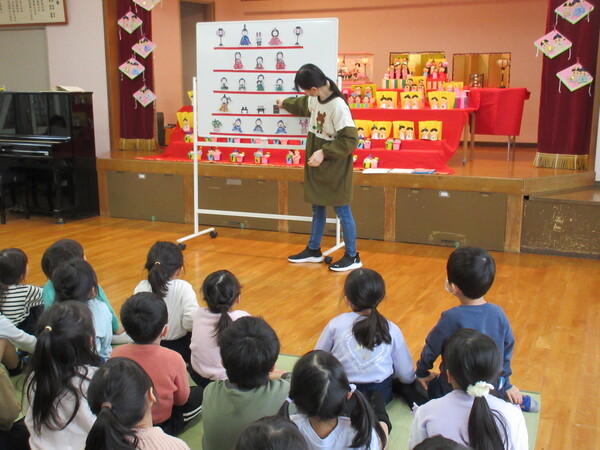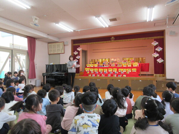 ひなまつりの由来を聞いたり、自分たちで作ったひな飾りを見せ合ったり、ゲームをしたりして楽しく過ごしました。「うれしいひなまつり」の歌も元気いっぱい歌い、笑顔あふれる時間となりました。