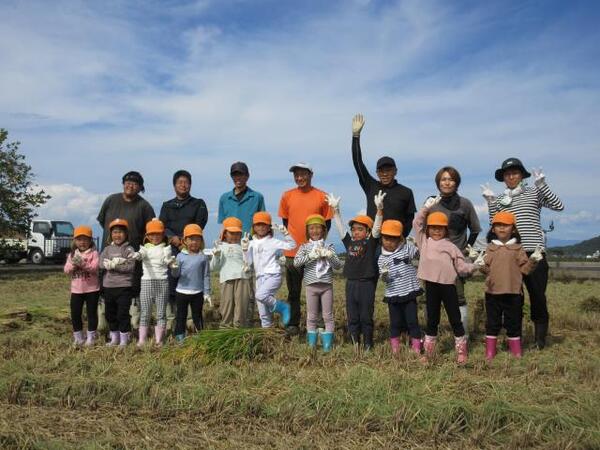 | 10月2日(木) 地域の方のご厚意で、年長児が稲刈り体験をしました。「かたいな〜」「力めっちゃいるな!」とお友だちと言い合いながら、とっても賑やかに楽しく稲刈りができました。おにぎりにしておいしくいただきます! | ||